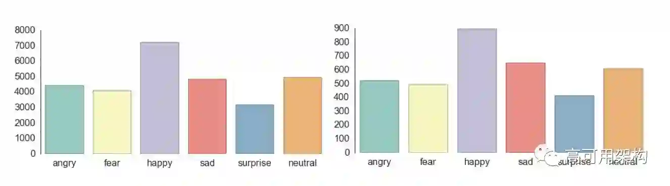 当作者分析语料数据集时,发现“disgust”分类相对于其它分类不均衡(只有113 张样本)。作者将两类相似的情感(disgust 和 anger)合并起来。为了防止数据倾斜,作者构建一个数据生成器 fer2013datagen.py [1],该生成器很容易分割训练集和保留数据集。本例使用 28709 张面部图片作为训练集,余下的图片作为测试集和验证集(每个数据集 3589 张)。这样我们获得了 6 类均衡的数据集,见图2,包含 happy, sad, surprise, fear, anger, and neutral。