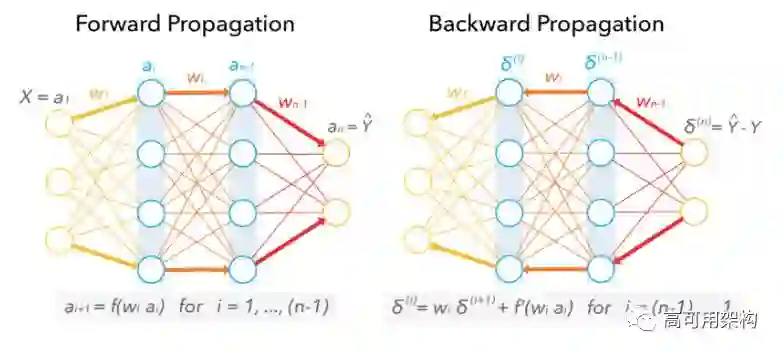 图 6. Neural network during training: Forward propagation (left) to Backward propagation (right).