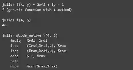 可以看到,Julia 的这种容易程度完全不同 —— 我从来都不想费心去看C中的汇编代码,因为这样做很痛苦,但我一直在看 Julia 汇编代码,因为它的可读性很好,而且我知道很多其他代码也是如此。这既是一种学习工具,也是指导整个生态系统实现卓越性能的一种方式。
