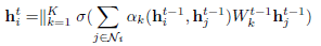 其中α(·)是一个注意力函数,它自适应地控制相邻节点j对节点i的贡献。为了学习不同子空间中的注意力权重,GAT还可以使用多注意力: