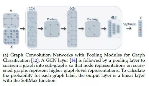 GCN方法又可以分为两大类,基于频谱(spectral-based)和基于空间(spatial-based)。基于频谱的方法从图信号处理的角度引入滤波器来定义图卷积,其中图卷积操作被解释为从图信号中去除噪声。基于空间的方法将图卷积表示为从邻域聚合特征信息,当图卷积网络的算法在节点层次运行时,图池化模块可以与图卷积层交错,将图粗化为高级子结构。如下图所示,这种架构设计可用于提取图的各级表示和执行图分类任务。