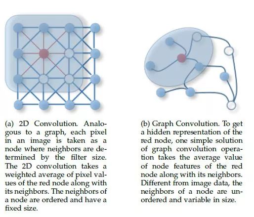 模拟传统卷积神经网络对图像的卷积运算,基于空间的方法基于节点的空间关系定义图卷积。为了将图像与图关联起来,可以将图像视为图的特殊形式,每个像素代表一个节点,如下图a所示,每个像素直接连接到其附近的像素。通过一个3×3的窗口,每个节点的邻域是其周围的8个像素。这八个像素的位置表示一个节点的邻居的顺序。然后,通过对每个通道上的中心节点及其相邻节点的像素值进行加权平均,对该3×3窗口应用一个滤波器。由于相邻节点的特定顺序,可以在不同的位置共享可训练权重。同样,对于一般的图,基于空间的图卷积将中心节点表示和相邻节点表示进行聚合,以获得该节点的新表示,如图b所示。
