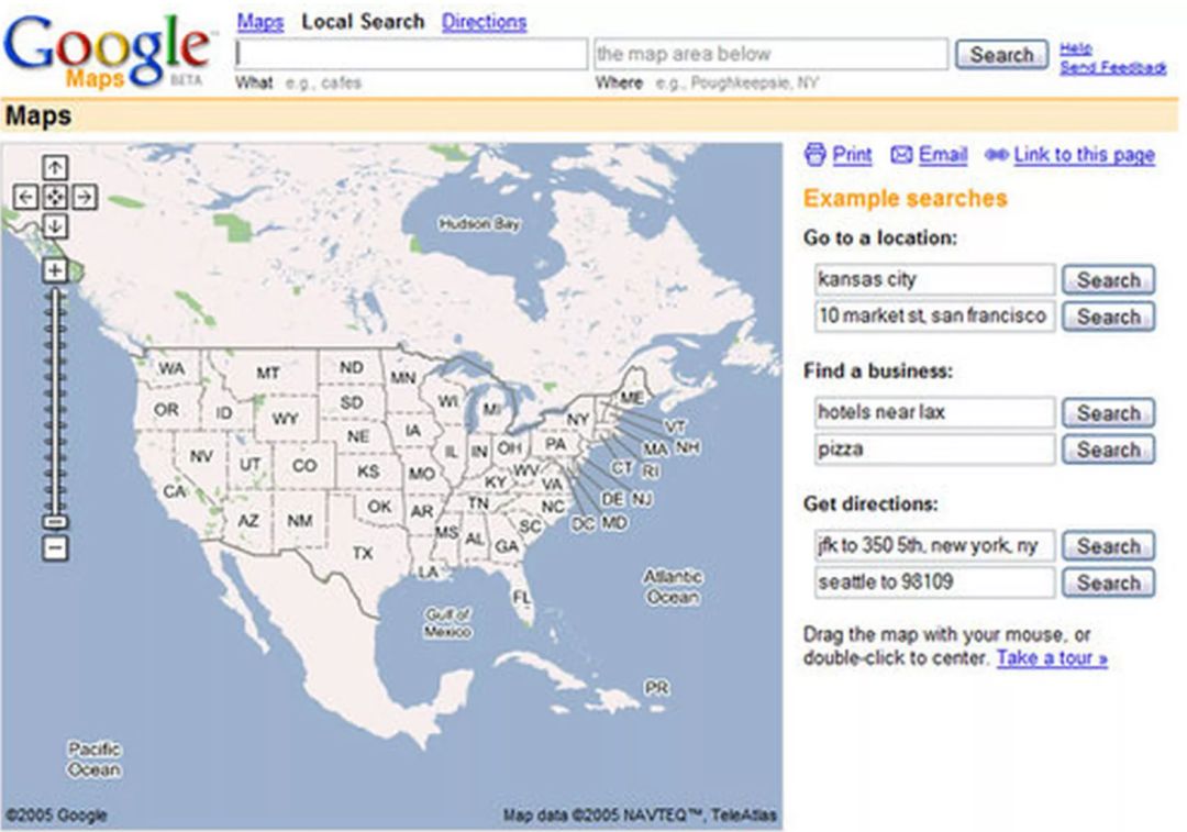 不幸的是,在没有地图配合的年代,Search by Location基本没什么价值。据Taylor回忆,当时一整天也难得有一个访问。但是有了Google Maps,Search by Location的威力就爆发出来了。Google Maps甫一诞生,使用感受就远远超过了Yahoo Maps和MapQuest,尽管它们出现得更早。