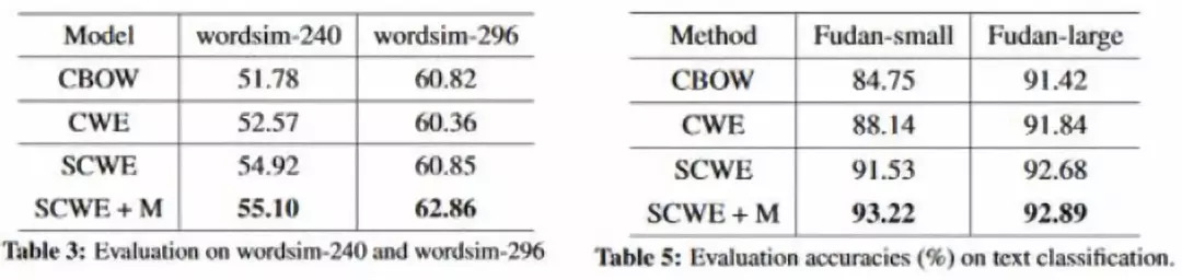 在 Word Similarity 和 Text Classification 上验证了其有效性,Word Similarity同样采用的评测文件是wordsim-240,wordsim-296,Text Classification采用的是 Fudan Corpus,具体的实验结果如下图: