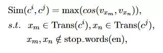 通过计算相似度来消除歧义,具体的公式如下, 其中c_i,c_j代表的是某个词中的第几个字,Trans(c_i)表示这个字的英文,stop-words(en)代表英文的停用词,x是Trans中的英文,具体来说,看上图,对于音乐这个词,c_1表示音,c_2表示乐,Trans(c_2)表示的是乐在上图中的英文集合,x_3就是pleasure或者是enjoyment。