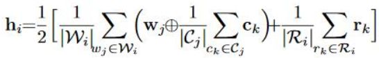 h_i是一个隐层表示,具体表示如下图,具体来说就是对于每一个上下文的词, 对其所有的character embedding求和取平均,然后和word embedding进行addition操作,然后对所有的上下文词求和取平均,這样就完成了word 和 character的结合,对于目标词所有的radical也是一样的求和取平均的操作,然后word+character与radical再次求和取平均,這样就完成了h_的隐层表示,至于word和character结合的时候,中间的那个操作符号,可以是addition,也可以是concatenation,這篇论文采用的是addition操作。