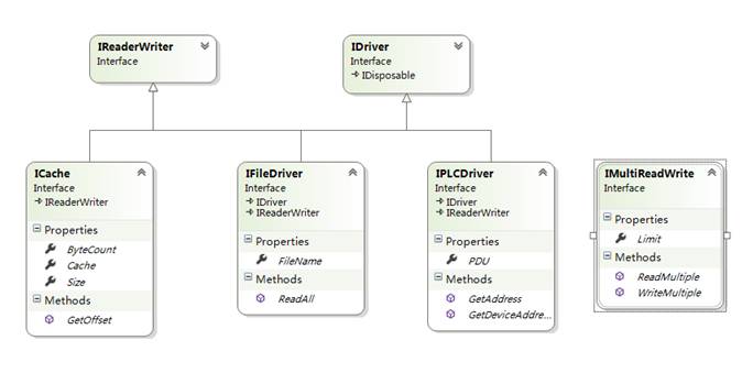 这样就有了两个基本接口(在Dataservice项目中):IReaderWriter,描述读写性。IDriver,描述连接性。