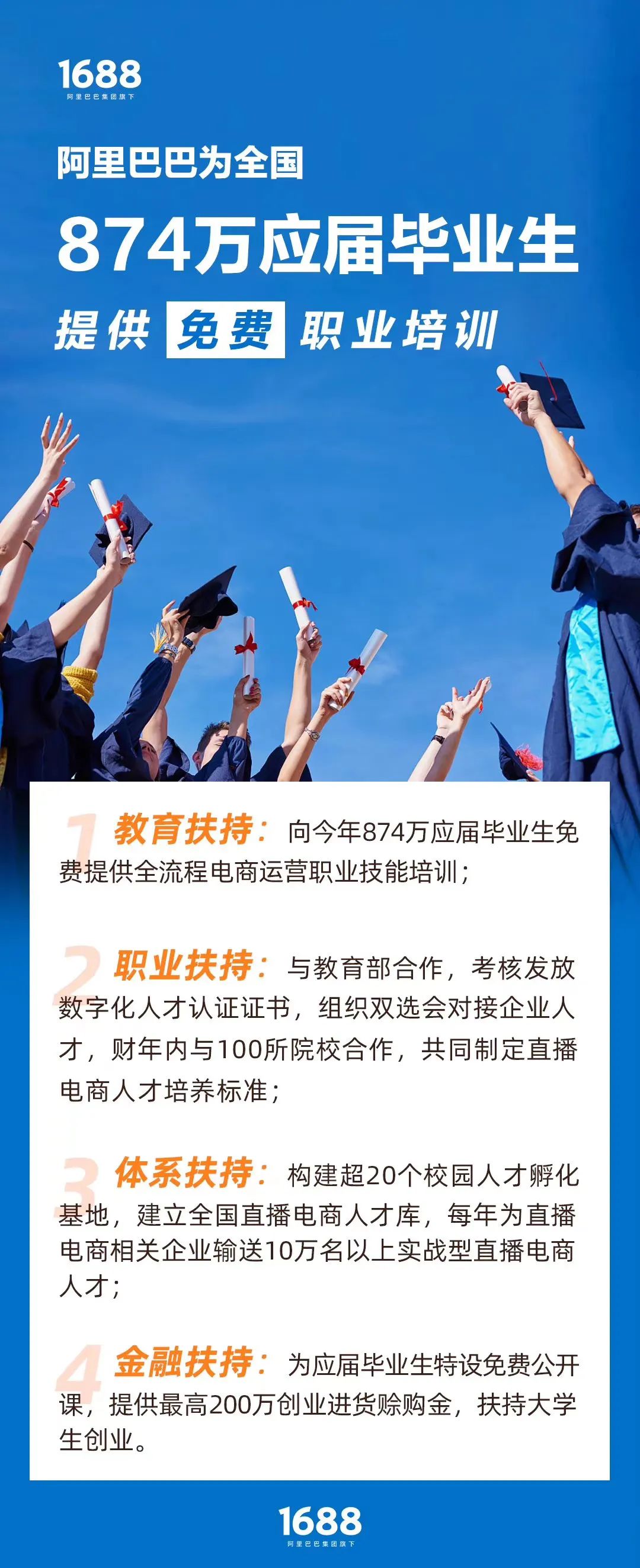 阿里1688宣布将为今明两年的毕业生免费提供电商运营职业技能培训,应届毕业生可通过验证学历信息免费获取课程。1688官博公告显示,每位大学生还可获得最高 200 万进货赊购金,用于自主创业。