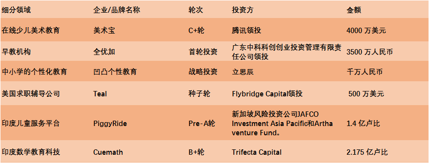 资本市场动态方面,美术宝获4000万美元C+轮投资;凹凸个性教育获立思辰数千万战略投资......