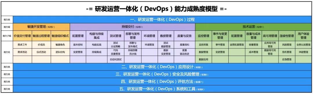 DevOps 标准评估体系主要包括敏捷开发管理、持续交付、技术运营、应用架构、安全及风险管理、系统和工具等部分的评估。目前,《研发运营一体化(DevOps)能力成熟度模型 第8部分 系统和工具》可正式开展评估。