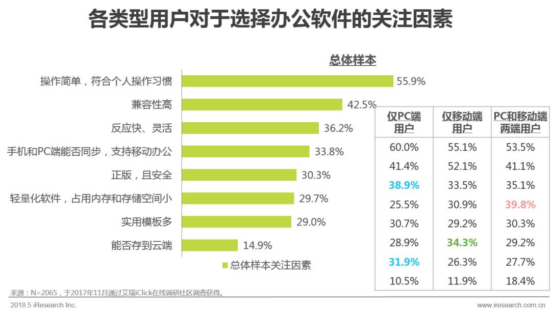 在高度成熟的PC市场中,办公软件又是其中发展历史相对悠久的类型,用户规模基本保持稳定。整个2017年,除去1月和10月受春节和国庆假期的影响导致PC端办公软件用户活跃数小幅下降外,其余各月的月均覆盖用户均在5.3亿上下小幅波动,预计这一数字在未来几年仍不会有太大变化。一方面,在PC端网民发展趋于稳定的背景下,PC软件市场进入存量阶段,但是由于办公软件的本身产品特点,该行业仍会长期保持较高的活跃度;另一方面,受场景和设备限制,移动办公仍无法完全替代PC办公。随着中国产业结构的升级改造,更多的传统企业会走向全面数字化,企业主体数量也不断增加,PC办公软件仍然具有一定成长空间。