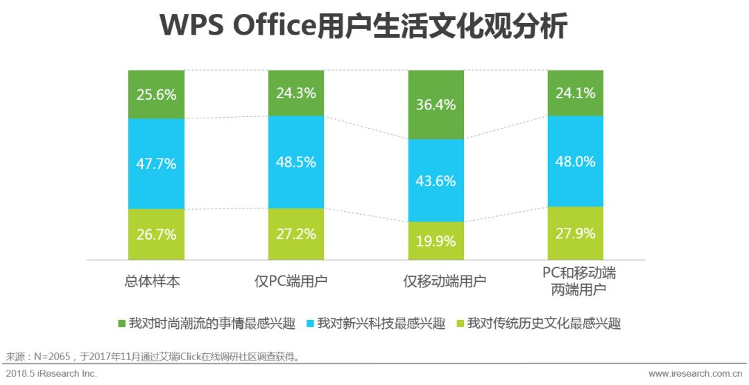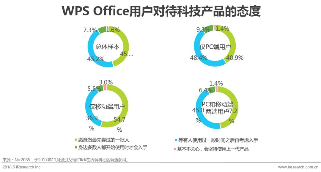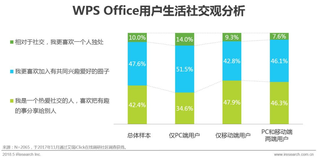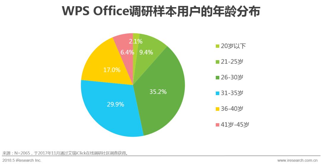 通过线上问卷的方式,本次调研共抽样获得2065名WPS Office用户,其中26-35岁的样本占总样本的65.1%,其次为36-40岁的用户(17.0%)。这一年龄段的用户正是城市中的核心工作人群,承担着一定的工作压力,可支配收入虽然尚在积累当中,但刚性消费需求较大。此外,本次调研抽样获得的WPS Office用户中还包括了10%左右的25岁及以下年轻学生人群,由此可见学校也是WPS Office的使用场景之一。总体来说,WPS Office用户结构健康,为产品的持续稳定发展奠定了基础。