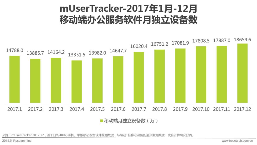 随着人们的生活服务向移动端迁移,移动办公服务软件的渗透率也在稳步上升中。2017年上半年,移动端办公服务软件月独立设备数基本稳定在1.4亿左右。而从下半年开始,移动端办公服务软件月独立设备数开始稳步上升,并在2017年12月达到1.86亿。