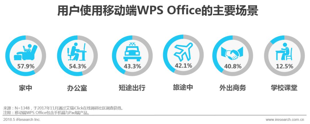 ◈多场景应用:根据调研数据,移动端WPS Office已经应用在家中、旅途、短途出行、学校等多个场景当中。