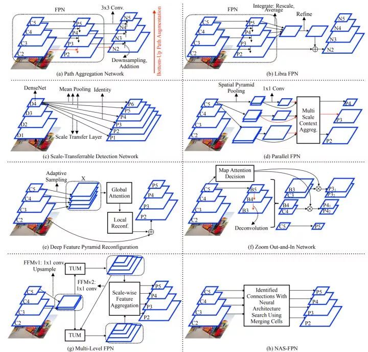 这种不平衡主要是指 FPN-based architecture 里,层级之间特征的不平衡性,Low Level 和 High Level 的特征之间互有定位/语义之间的优缺点,如何 mitigate 这种不平衡来达到最佳的检测效果?而解决方案也大多是结构上的,来看看下面各式各样的连接方法: