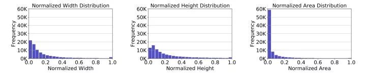 中的 investigation 指出这种 imbalance 会极大影响 overall detection performance。下图表达了 COCO 数据集中长宽面积上的不平衡: