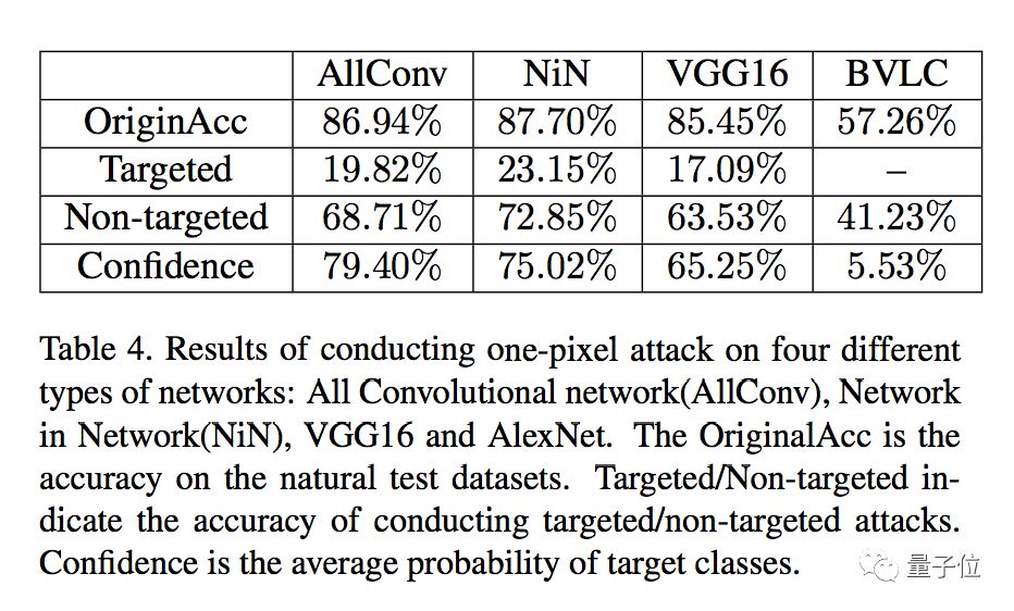 in Network(NiN)、VGG16、和AlexNet的测试中,这种方法取得的成功率如下表所示: