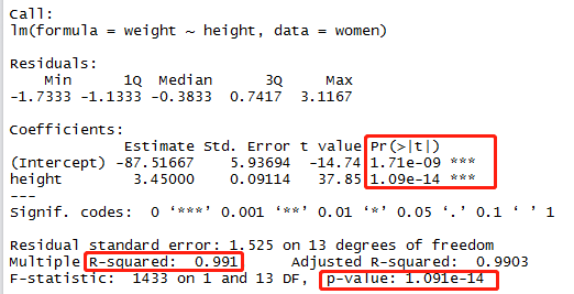 再看截距项和系数,都通过了t检验,且height的系数为正,表明随着身高的增长,体重也增长,符合客观事实。