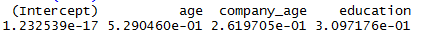 可以得出同样的结论:age这个变量较company_age和education对回归方程的影响更大。