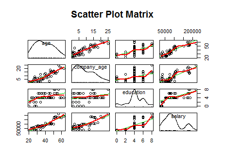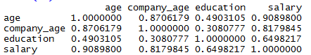 可以看到salary与其余三个变量都有比较明显的正的线性相关关系,另外age和company_age也有明显的正相关。