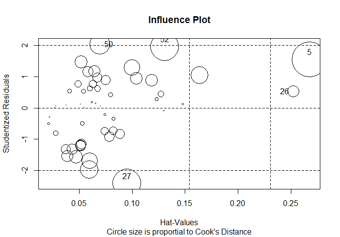 influencePlot(fit, id.method = "identify", main = "Influence Plot",