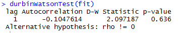 p值0.636接受原假设,说明无自相关性,误差项之间独立。
