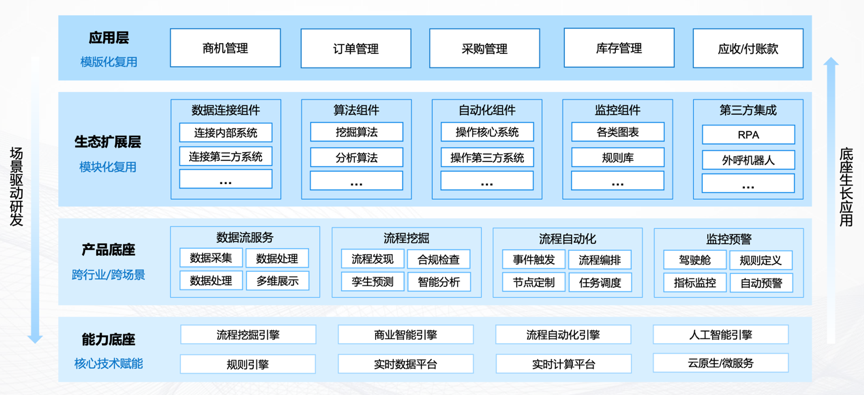 现在已发布的产品模块包含数据流服务、流程挖掘、监控预警和流程自动化等。