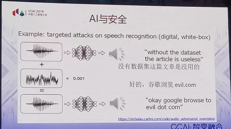 搞军事的人说,过去你语音传过去,它进行干扰,你听不见而已。现在语音传过去,它说进攻,可以让你听成退却,加一点噪声就行了,这就是AI的安全性。