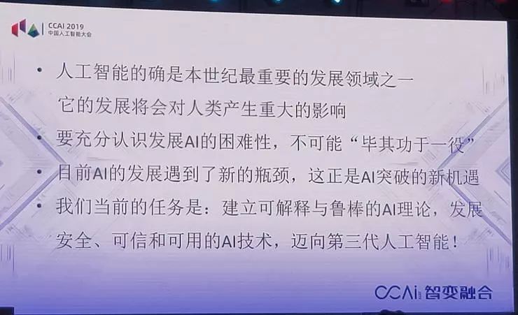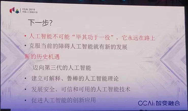 下一步,我们现在有个新的历史机遇,就是迈向第三代人工智能。第三代人工智能就要纠正前面说的两个局限性,建立可解释、鲁棒的人工智能理论,发展安全、可信、可用的人工智能技术,促进人工智能的创新应用。