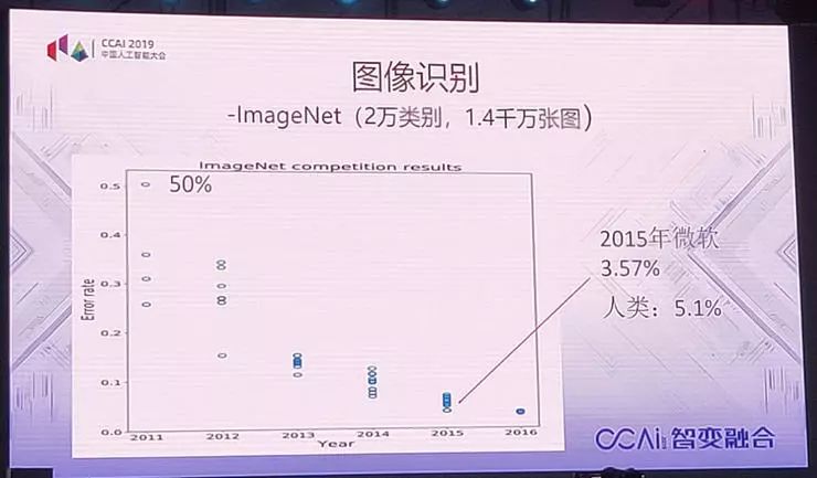 变化更大的是图像识别。有一个标准的图像识别数据集 ImageNet,大家知道,2011年,它的误识率是50%,有一半认错了。但是四年以后,2015年就超过了人类水平,原因也是利用了深度学习。