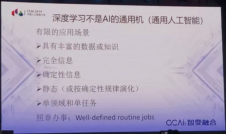 这不能不考虑到人工智能的特点,我们说深度学习根本不是AI的通用机。现在大家在寻找通用的人工智能,到底有没有,还有争论,不去管它,但至少深度学习不是人工智能。这个非常明显,第一代人工智能也好,第二代人工智能也好,它的应用场景必须满足以下五个条件。