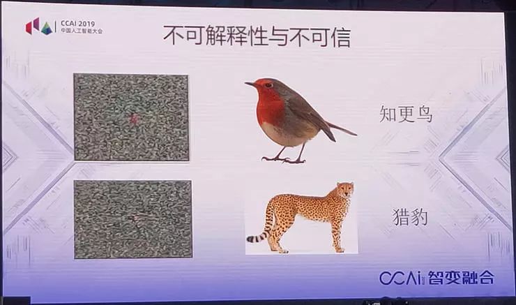 就是这样的系统,你给它噪声,它可以识别为知更鸟。你给它一个噪声,它可以识别为猎豹。换句话说,模式识别系统并没有达到人类认知的水平,只达到低等动物的水平,所以感知这个词翻译得非常好,感觉+知觉,低等动物只有感觉,没有认知。所以机器现在达到的水平是低等动物的水平,它可以分辨不同的物体,但是它本质上不认识这个物体。另外是它非常脆弱,非常容易受攻击。