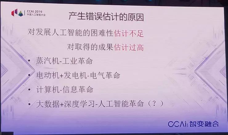 技术已经完全成熟,我们现在的研究已不成熟,主要是应用问题。为什么在人工智能上往往产生乐观估计?主要原因有两个:一个是对发展人工智能的困难性估计不足,对取得的成果估计过高。一个估计不足,一个估计过高,就产生了问题。另外一个很重要的原因,受历史事件的影响。过去我们发现,有了蒸汽机以后就产生了工业革命,有了电动机发动机以后就产生了电气革命,有了计算机以后产生了信息革命,大家很希望有一个东西出来以后引起人工智能的革命。