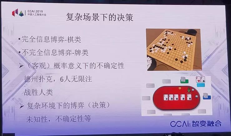 举个简单的例子,复合场景下的决策,完全信息条件下的决策或者完全信息下的博弈,计算机战胜人类是绝对的。下面一个问题,不完全信息的博弈及打牌,大家都知道,今年5月份对扑克牌这个问题也解决了。换句话说,6人无限注的德州扑克,计算机能战胜人类,这就意味着概率意义下的不确定性,机器也可以战胜人类。但是人类的决策环境都不符合前面两个条件。所以在复合环境下的博弈或者复杂环境下的决策,机器跟人类还差得比较远。从这里来讲,应用场景是极为重要的。