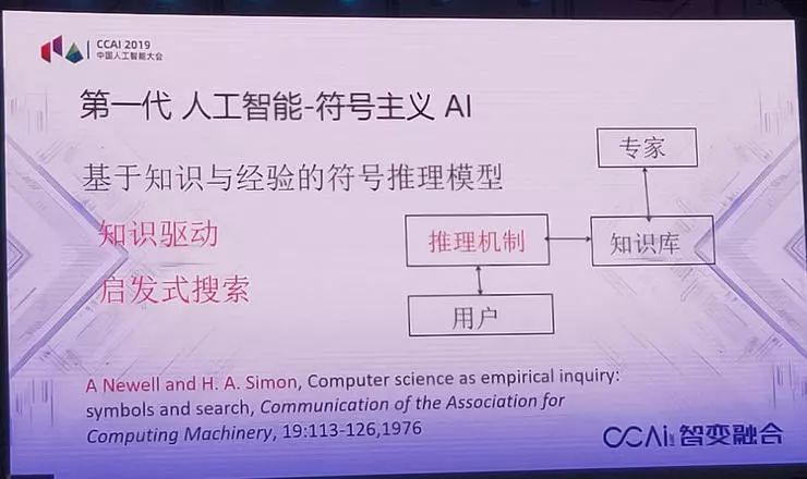 我们看一下人工智能究竟做了什么事儿?第一件事就是第一代人工智能提出的符号模型,以知识经验为基础的推理模型,这是人工智能的第一个重大突破。这个突破后来产生了一个结果,就是这个理论提出时有个非常乐观的估计,1956年由西蒙提出,基于这种模型,十年之后机器可以打败所有棋手,二十年以后机器取代人类所有的工作。实际并不是这样,六十年以后机器才打败棋手,机器究竟代替人类的所有工作是什么时间,可能还很遥远,这也是人工智能的另外一个特点,往往被高估。