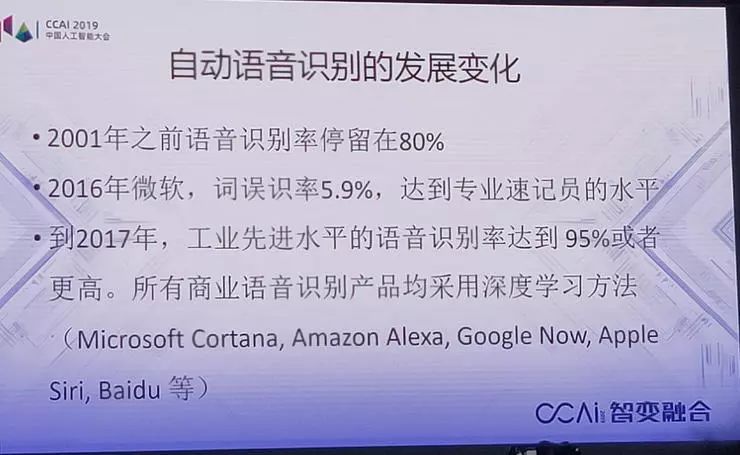 这就带来很大的变化,大家也看到了,语音识别,2001年时它的识别率停留在80%,也就是20%的误识别率;2016年误识率就降到了5.9%,达到专业速记员的水平,到了2017年,所有产品包括谷歌、微软,包括中国的讯飞、百度,用的全是深度学习。