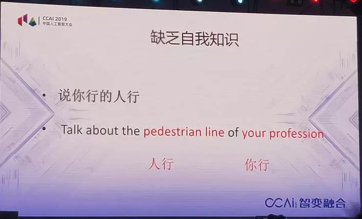 另外,缺少自我知识,这是非常重要的。你说我用这个话,让它翻译,「说你行的人行」,这句话计算机怎么翻呢?「说你专业的人行道」,瞎翻,为什么瞎翻?它不知道自己不知道,没有任何自知之明。这是很危险的。为什么翻译成人行道呢?「人行」,它以为是人行道。为什么翻译成「你的专业」呢?「你行」。这是非常危险的。大家想想,我带了一个翻译,翻译水平挺高的,大多数翻译是很准确的,但是他会瞎说,你敢用吗?人类不会,因为他知道这句话如果没有听明白会再问是什么意思,计算机没有自知之明,人贵有自知之明,这是人类智慧的一个部分。怎么让机器有自知之明?这是很困难的事。