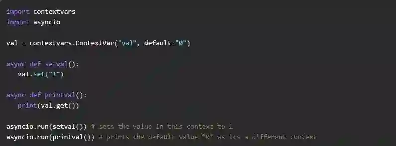 下面是一个如何在Python 3.7中设置和使用上下文变量的快速示例。请注意,当你运行这个例子时,第二个async调用将生成一个默认值,因为它在不同的上下文中进行了计算。