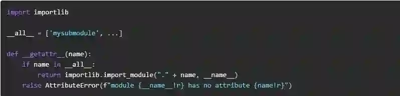 在不深入探讨这种方法所暴露的技术可能性的情况下,它最清晰和最明显的用例之一是,它现在允许模块延迟加载。请思考下面的例子(从PEP-562修改而来)以及它的用法。