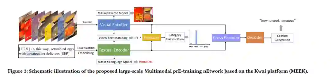为此,研究团队设计了一个大规模多模态的预训练网络,通过五个任务来加强下游视频表征,该网络在研究团队收集的 1100 万个微视频上训练。之后,研究团队提出了一种基于流的多样化字幕模型,以根据用户的搜索需求生成不同的字幕。该模型通过重建损失在先验和后验之间的KL分歧进行优化。通过构建由 69 万个<查询,短视频>对组成的黄金数据集合,作者验证了他们的模型,实验结果也证明了其优越性。