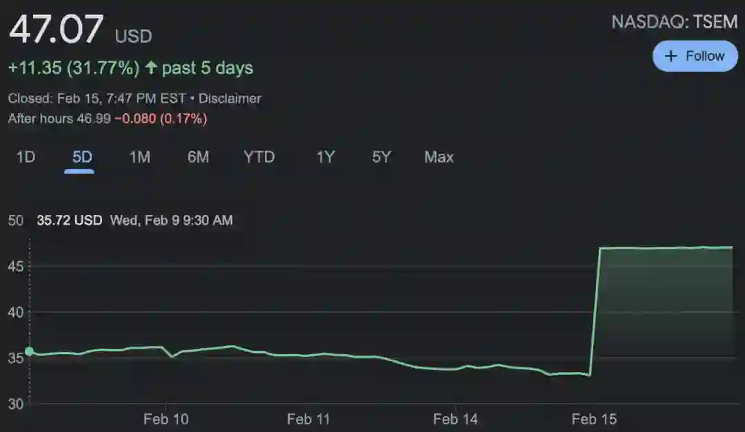 消息一出,Tower的股票径直上涨42%,英特尔也跟着涨了1.4%。