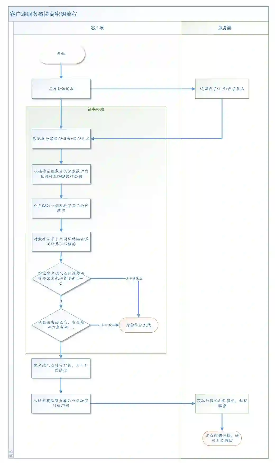 客户端在拿到服务器的证书后,就需要验证证书编号是否能在对应的CA机构查到,并且核对证书的基本信息如证书上的域名是否与当前访问的域名一致等等,还可以拿到证书中服务器的公钥信息用于协商对称密钥!