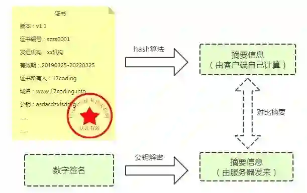 服务器在与客户端通信的时候,就会将数字证书和数字签名出示给客户端了。客户端拿到数字证书和数字签名后,先通过操作系统或者浏览器内置信任的CA机构找到对应CA机构的公钥对数字签名进行解密,然后采用同样的摘要算法计算数字证书的摘要,如果自己计算的摘要与服务器发来的摘要一致,则证书是没有被篡改过的!这样就防止了篡改!第三方拿不到CA机构的私钥,也就无法对摘要进行加密,如果是第三方伪造的签名自然也在客户端也就无法解密,这就防止了伪造!所以数字签名就是通过这种机制来保证数字证书被篡改和被伪造。具体流程如下: