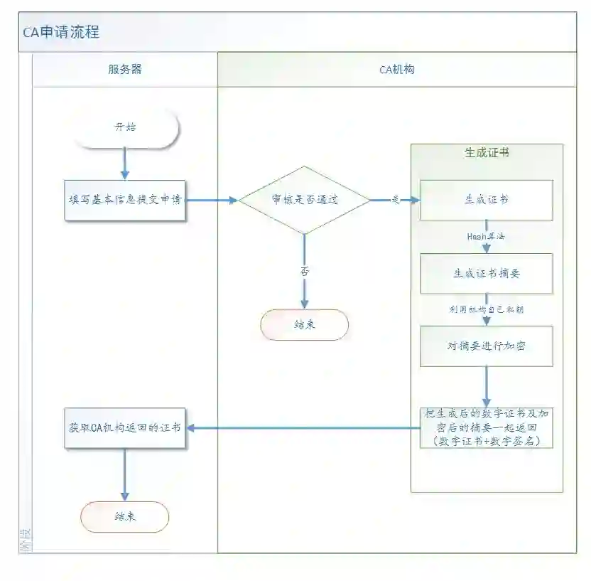 服务器提交自己的基本信息想CA机构提出申请,CA机构在给服务器颁发证书的时候,会连同数字证书以及根据证书计算的摘要一同发送给服务器,且这个摘要是需要经过CA机构自己的私钥进行加密的。申请流程如下: