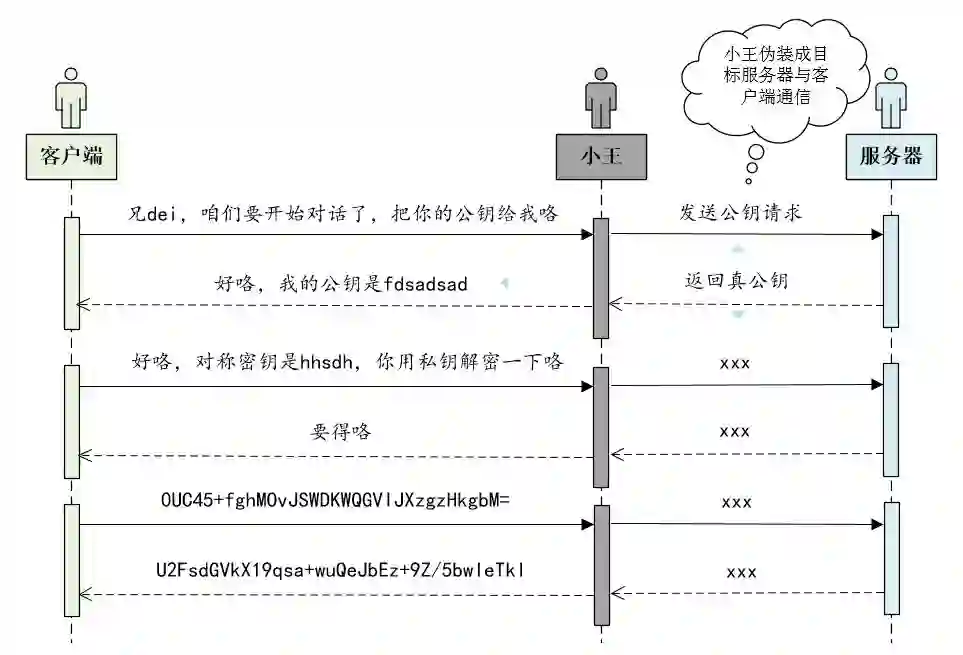 也就是说小王可以伪装成服务器,与客户端进行通信。类似于你与服务端之间多了一个中间商!也就是说协商密钥的过程依然存在漏洞!