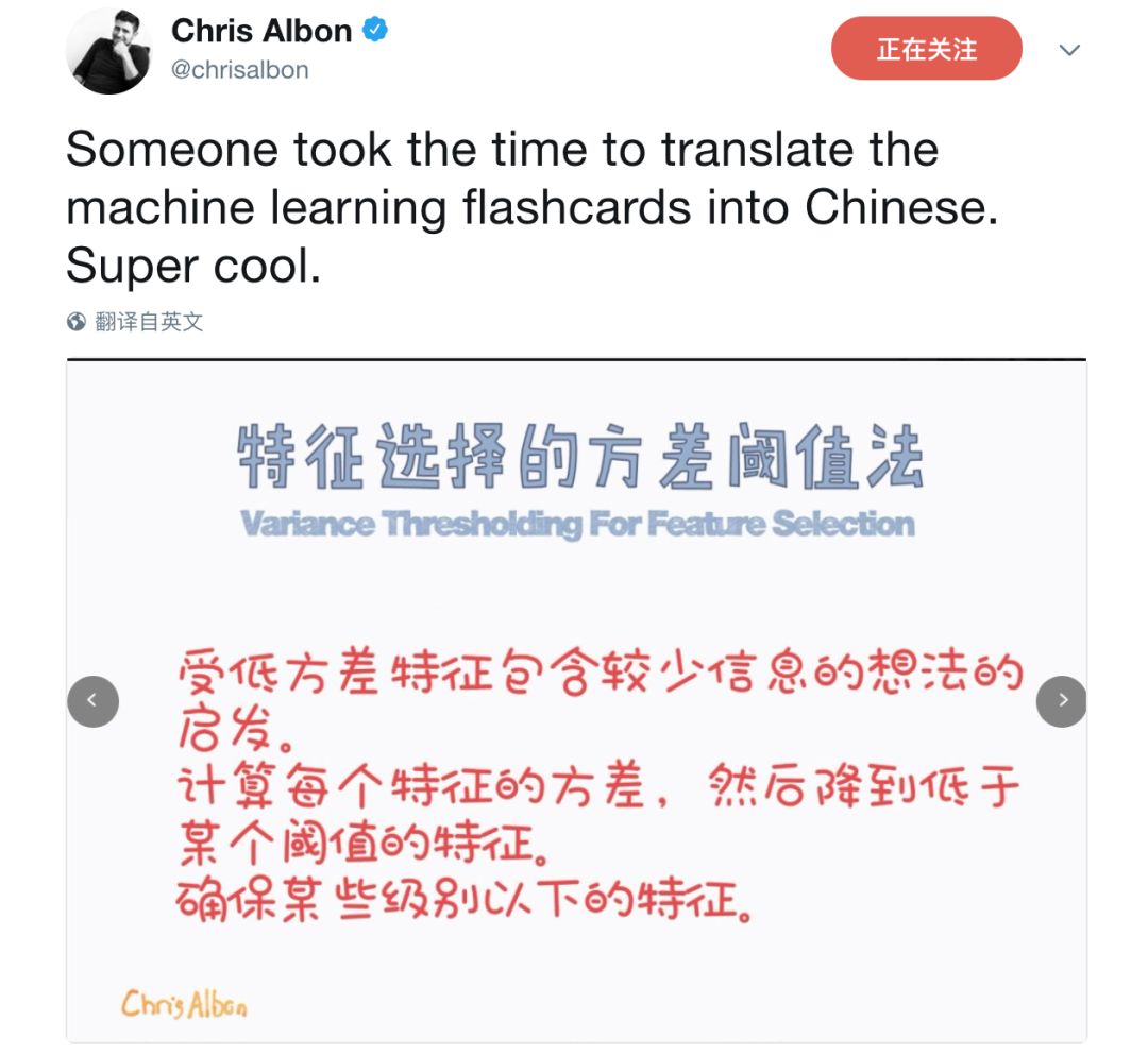 首批小抄表刚刚完成时,我们战战兢兢的把几张汉化作品发给了原作者Chris Albon,大咖不仅回复了我们,还在推特乐呵呵的po出了我们的成果:“有人把小抄表翻译成了汉语!Super cool!”(被大咖表扬笑出声!)