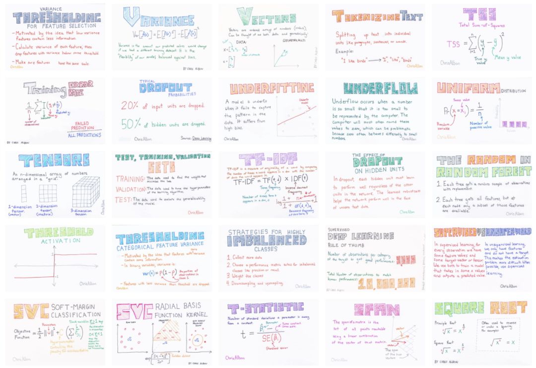在他自己学习机器学习的时候,发现通过这样的小卡片理解和记忆机器学习相关概念,比单纯读教科书要有效的多。于是便总结了300+个机器学习概念,并用彩笔手绘、扫描,制作了这套精致的小抄表礼包。