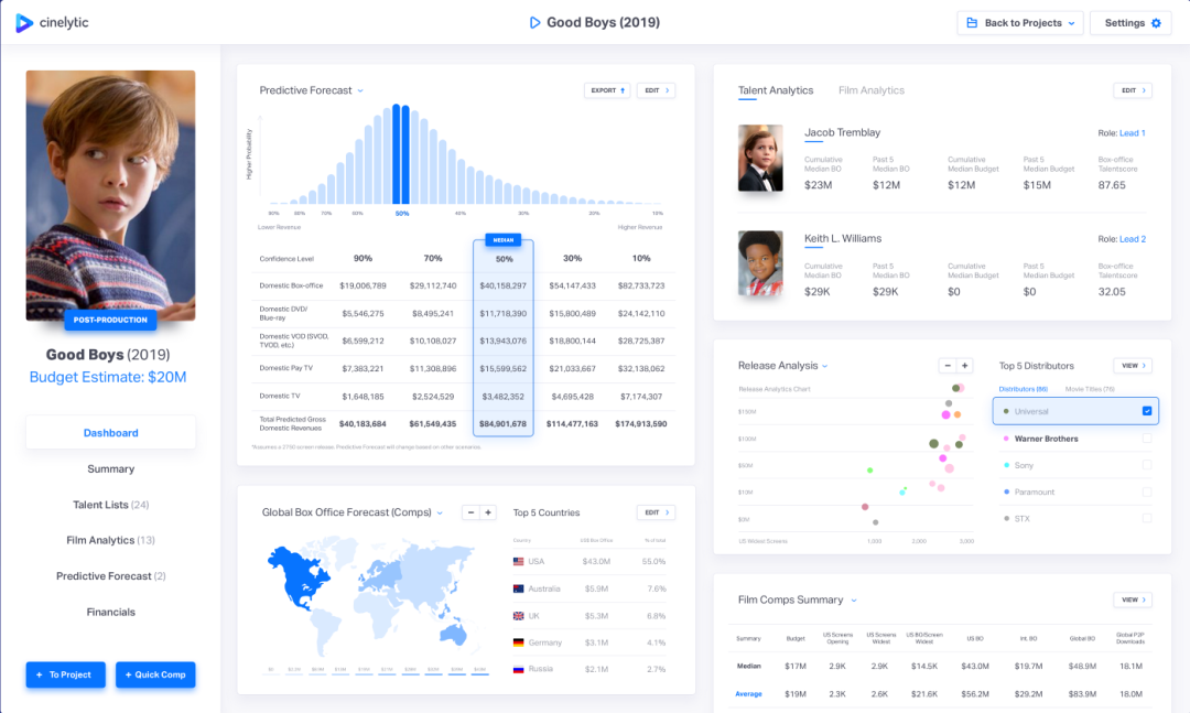Cinelytic联合创始人兼首席执行官Tobias Queisser曾在一次采访中谈到:“用Cinelytic软件可以单独比较两位女演员,也可以在特定的电影场景里进行比较。我们可以设计两个场景,看看对于一部特别的影片,Emma Watson和Jennifer Lawrence在哪些领域有更大的影响力。”