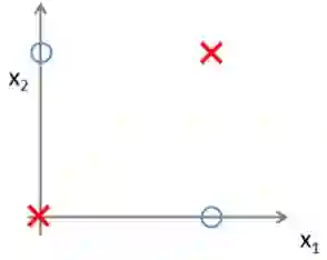 现在我们来看一个简单的例子,帮助我们了解为什么没有非线性,神经网络甚至无法逼近异或门(XOR gate)、同或门(XNOR gate)等简单函数。下图是一个异或门函数。叉和圈代表了数据集的两个类别。当 x_1、x_2 两个特征一样时,类别标签是红叉;不一样,就是蓝圈。两个红叉对于输入值 (0,0) 和 (1,1) 都有输出值 0,两个蓝圈对于输入值 (0,1) 和 (1,0) 都有输出值 1。