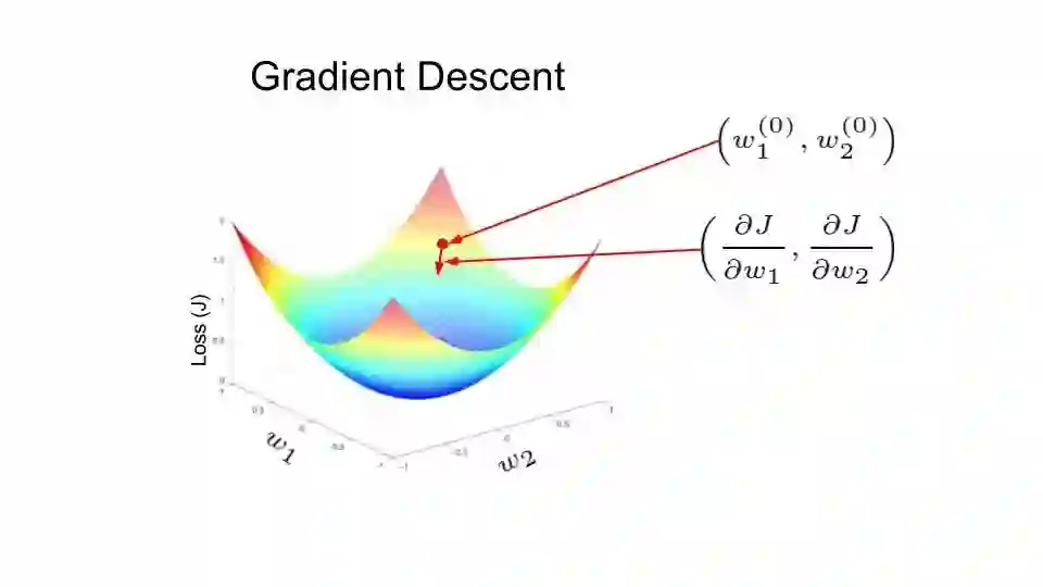 在下图中,损失函数的形状像一个碗。在训练过程的任一点上,损失函数关于梯度的偏导数是那个位置的梯度。沿偏导数预测的方向移动,就可以到达谷底,使损失函数最小化。使用函数的偏导数迭代地寻找局部极小值的方法叫作梯度下降。